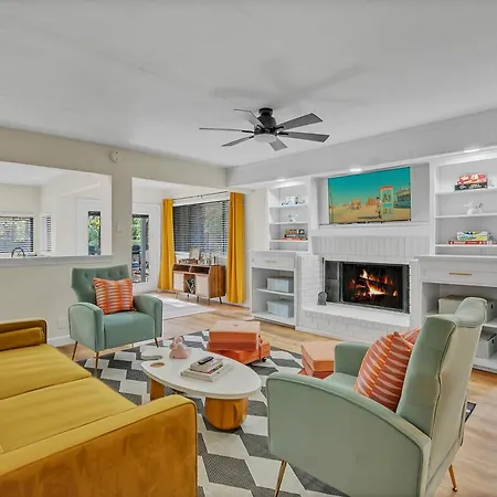 Wes Anderson-Theme 5Bd - Movie Theater & Pingpong Villa ligt op 2 km van het Oklahoma Aquarium en nodigt gasten uit om te ontspannen op een patio. Gasten kunnen genieten van tafeltennis in de villa, gelegen op afstand van 4 km van River Spirit Casino Resort.